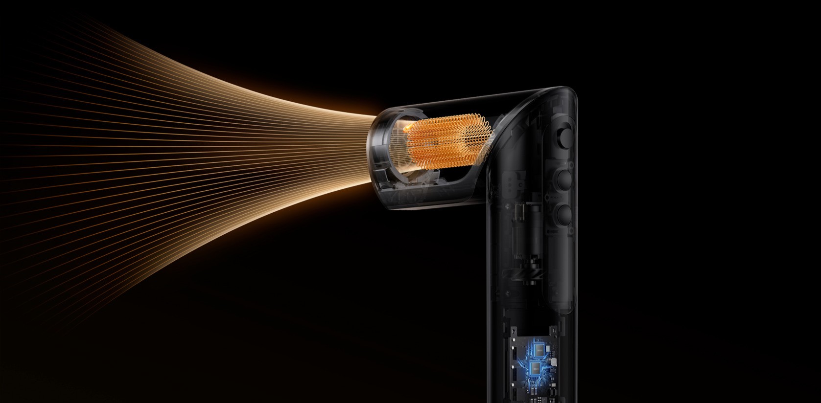 Фен оснащен высокоскоростным двигателем с частотой вращения до 110 000 об/мин. Он формирует плотный поток воздуха со скоростью до 60 км/ч при мощности 1400 Вт. Такое сочетание позволяет быстро высушивать волосы без перегрева и излишнего воздействия температуры.