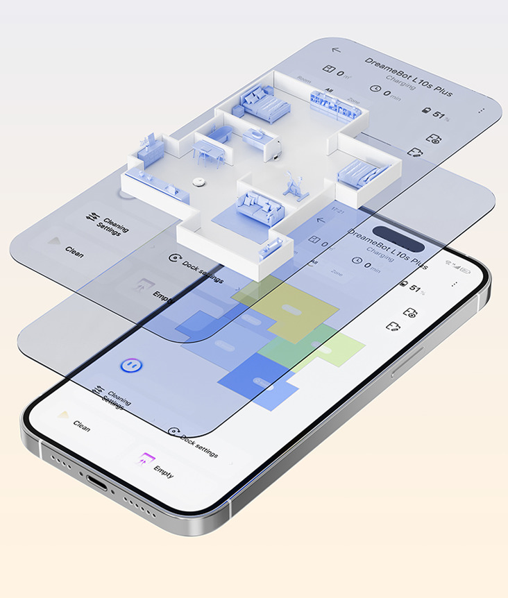 Настройте работу в соответствии с вашими нуждами с помощью приложения Dreamehome. Выбирайте порядок уборки, мощность и устанавливайте запретные зоны в зависимости от типов помещений.